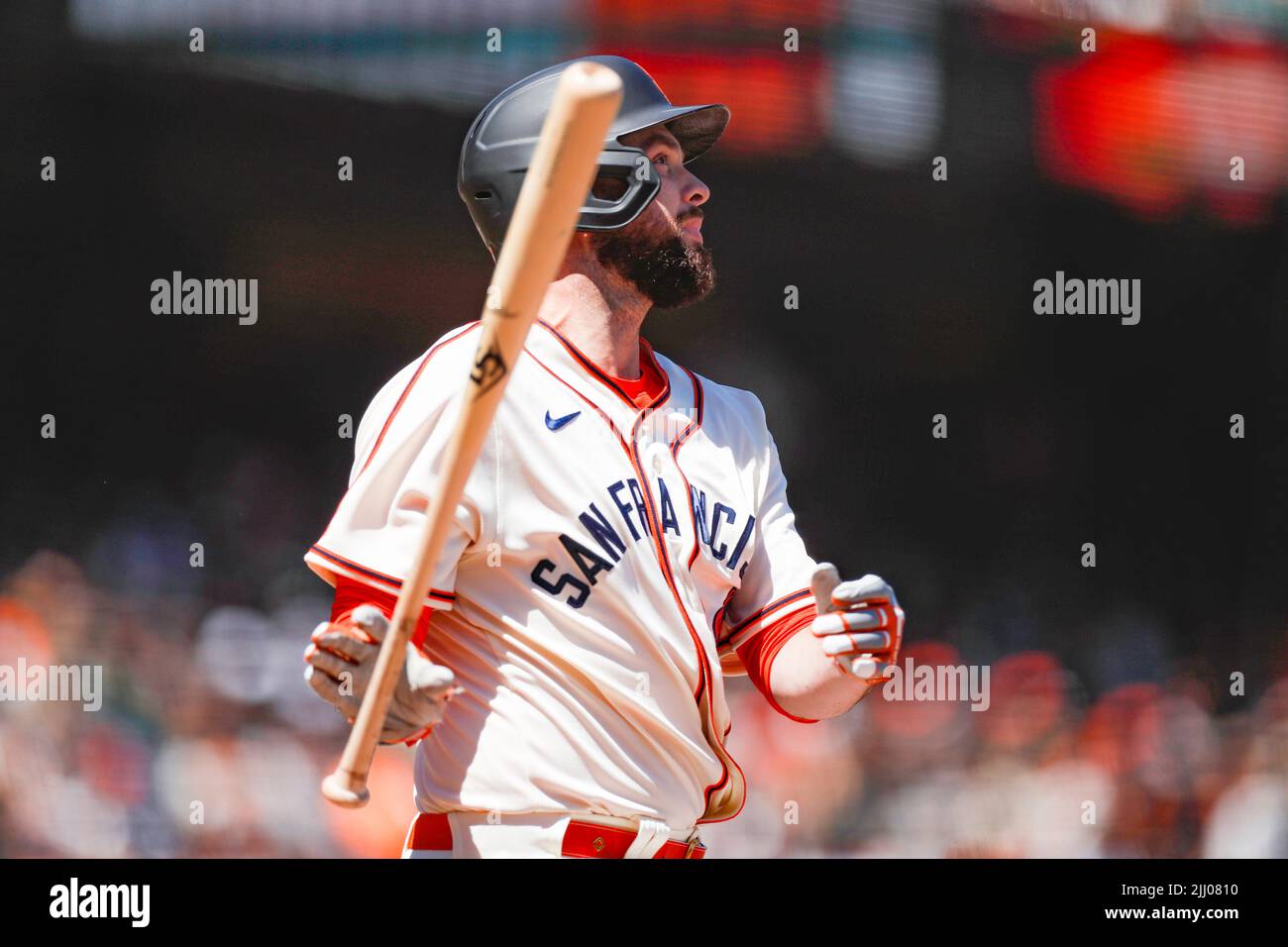San Francisco United States 17th July 2022 San Francisco Giants Brandon Belt 9 Hits A Home Run Against Milwaukee Brewers Jason Alexander 41 In The Sixth Inning At Oracle Park In San
